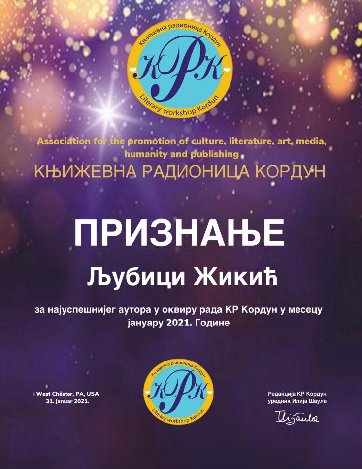 Ljubica Žikić autor za mesec januar 2021, priznanje Književne radionice Kordun